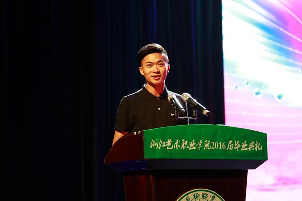 影视技术系13多媒体班李杰作为毕业生代表发言。青春是最美的奋斗,青春是最美的故事,青春是最美的记忆。李杰回顾了三年学习生涯,改变和成长是大学送给毕业生最好的毕业礼物。他说,毕业生会牢记母校,牢记大学时光留下的最真挚的友谊,“我们总以为自己已经长大,总以为自己可以毫不在乎,但当离别就这样不依不饶地到来,才发现自己与浙艺已经血脉相连。”他和所有毕业生约定:找到自己的方向,做最好的自我!别忘了:常回家看看。