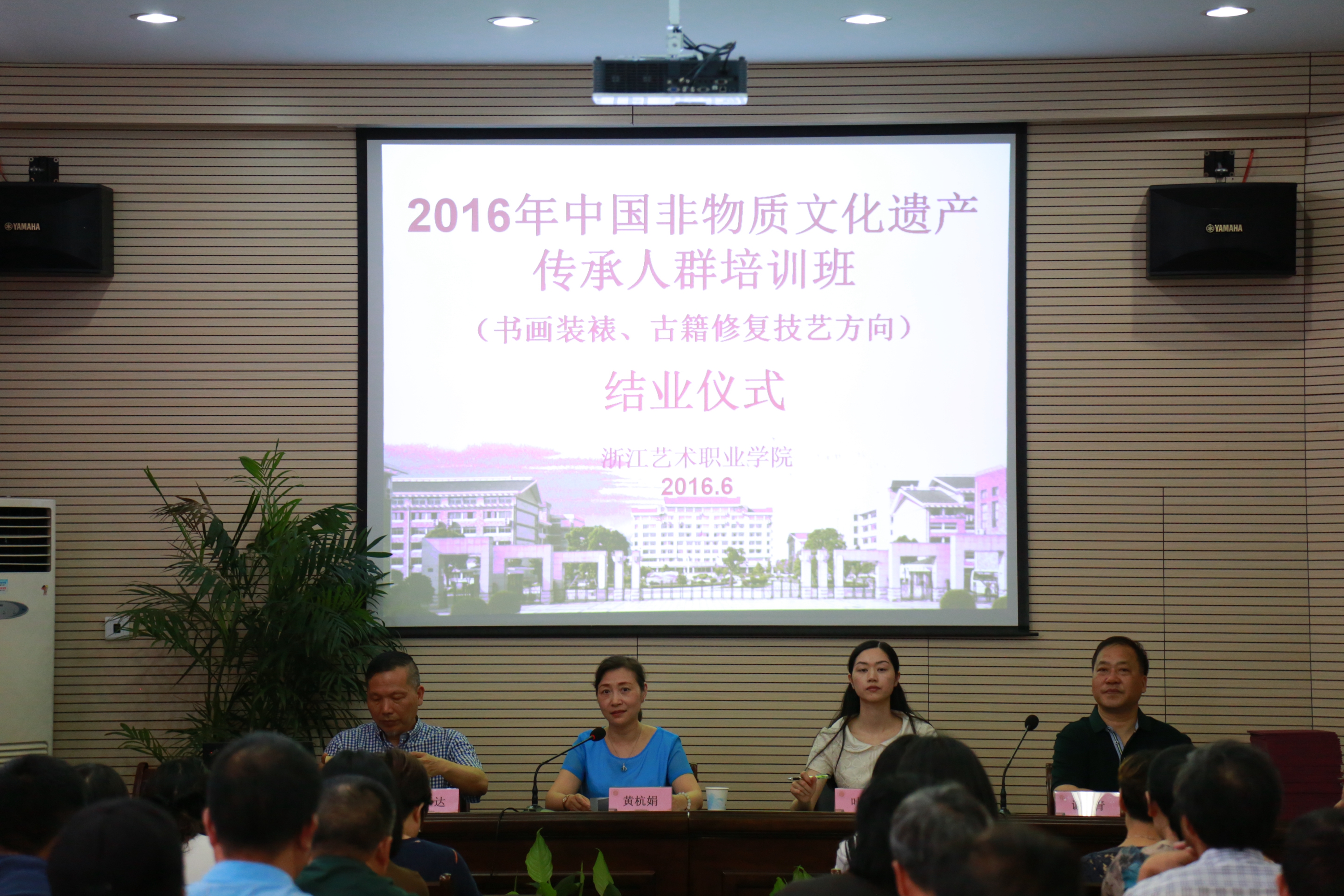 结业典礼后,黄杭娟与文化厅非遗处叶涛等,和全体学员一起参观了结业成果展。展览作品宗旨是“正宗、杰出、创新、适销”,包括对书画装裱、古籍修复、陶瓷制造、泥塑等非遗项目的传承、创新、应用、衍生品开发等。52位优秀非遗传承人群培训班学员在各领域导师指导下,或独立创作,或与同学合作,熬夜加班赶制结业作品。现场有从水里抢救出来的拓片、磨了一个星期的石雕螃蟹、8米多长新装裱的《金刚经》手卷、纪念这次学习经历雕刻的印章……学员朱煜峰的作品特别有创意,他用培训班所学的古籍修复“包背装”技艺做了一本日志,记载在浙艺学习的每一天情况,堪称让传统走进生活的典范。展览后朱煜峰把这本日记送给学院留存。(包背装是中国古代图书的一种装订形式,书页背对背地正折起来,使有文字的一面向外,版口作为书口,然后将书页的两边粘在书脊上,再用纸捻穿订,最后用整张的书衣绕背包裹。)