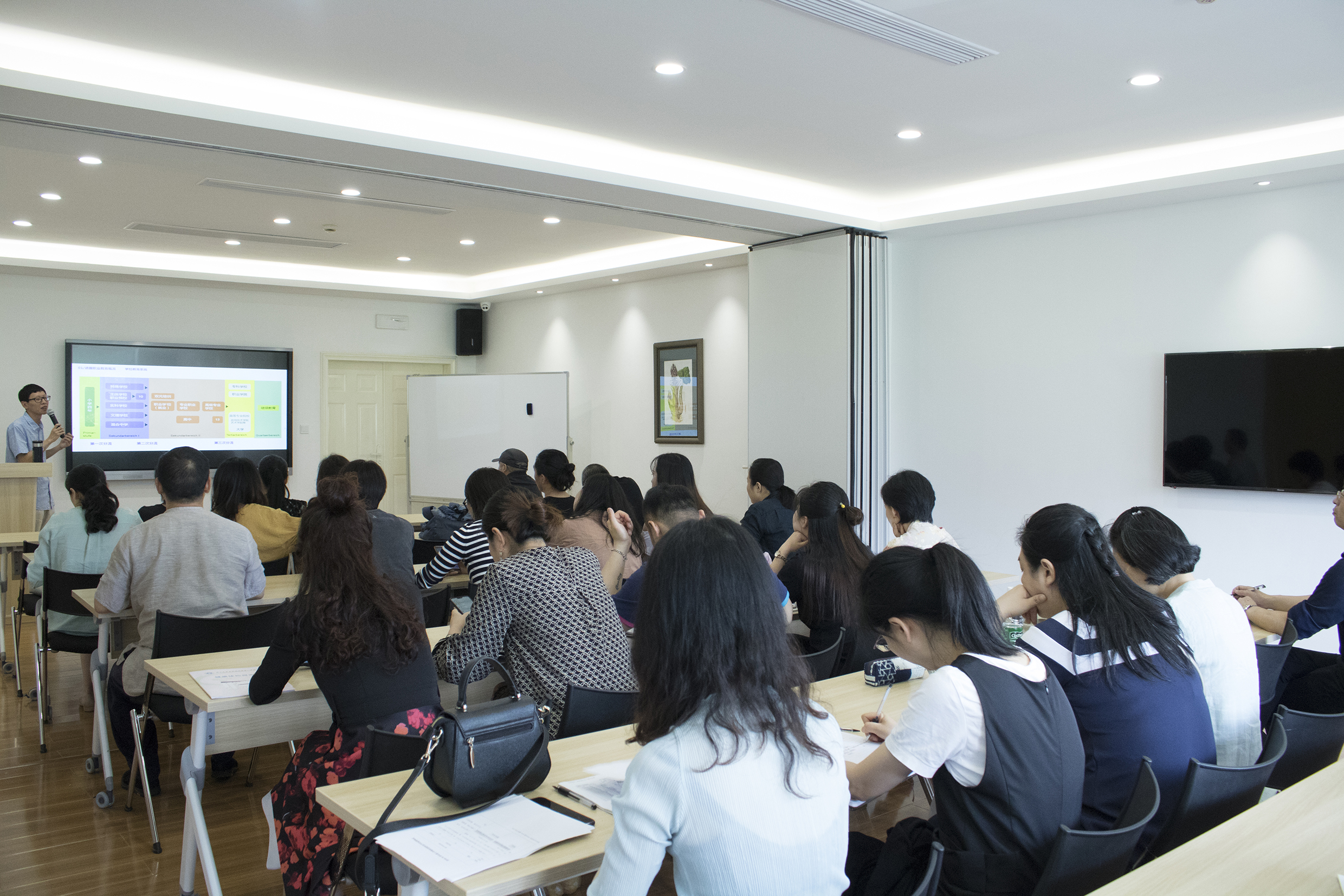 叶峰泉从德国职业教育概况、德国高等职业教育概况、双元制教育(学徒制)、企业考察等方面出发,向大家分享了德国的教育体系、双元学习、培训等情况,使大家多角度了解德国职业教育的发展模式和发展走向,他结合我校广告设计与制作专业的建设和教学情况分析了国内艺术类高职院校的可提升空间。