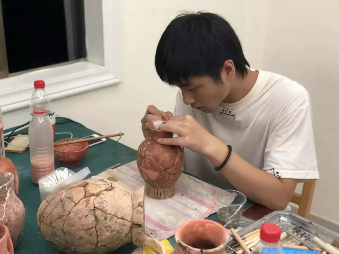 遗址的探方中随处散落着碎陶片,文物修复师生的工作就是将成百上千的碎片通过修复方案的确定,经拍照、档案记录、清理、拼接、补缺等修复工序,把碎片复原成器。众所周知,考古工作条件十分艰苦,修复的工地里没有空调,只有电风扇,正是文物修复师生们对专业工作的热爱与执着,才能顶着高温酷暑,放弃暑假休息和舒适的环境,投身到文物修复的重要工作中。