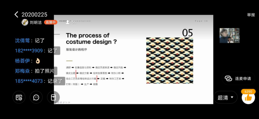 通过腾讯课堂进行直播教学,在平台上观看老师的直播并在讨论区与老师进行互动,对课堂中的疑问及时提出,按照教学要求完成课堂作业。