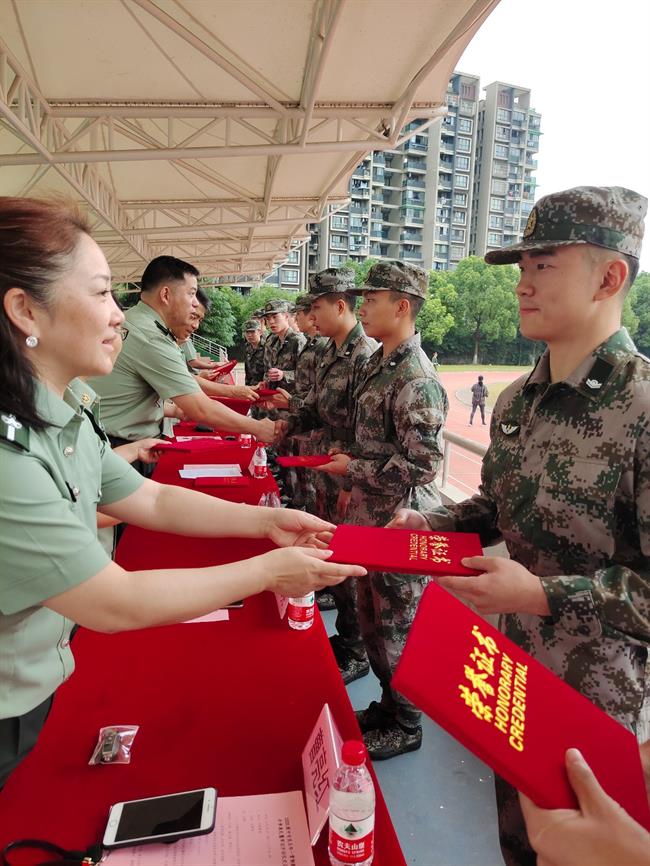 学工部副部长吴颖宣读学生军训团干部及教官名单。学工部副部长张志扬为军训团授旗。沈军甫、吴颖、张志扬、各系书记现场为全体教官颁发聘书。教官们现场进行队列展示。