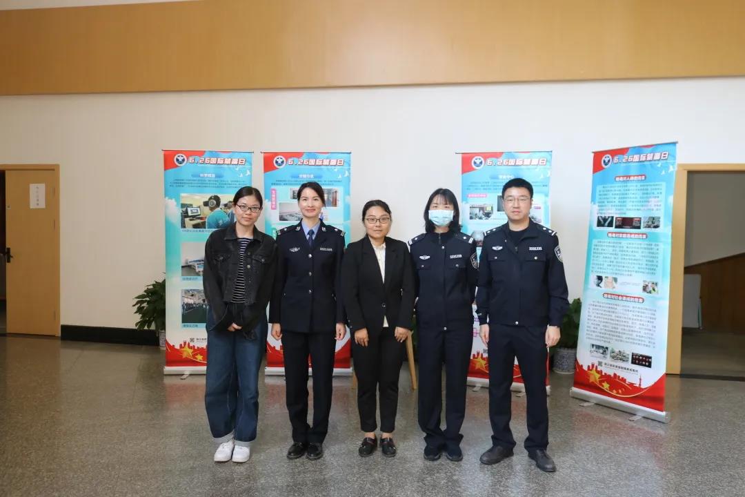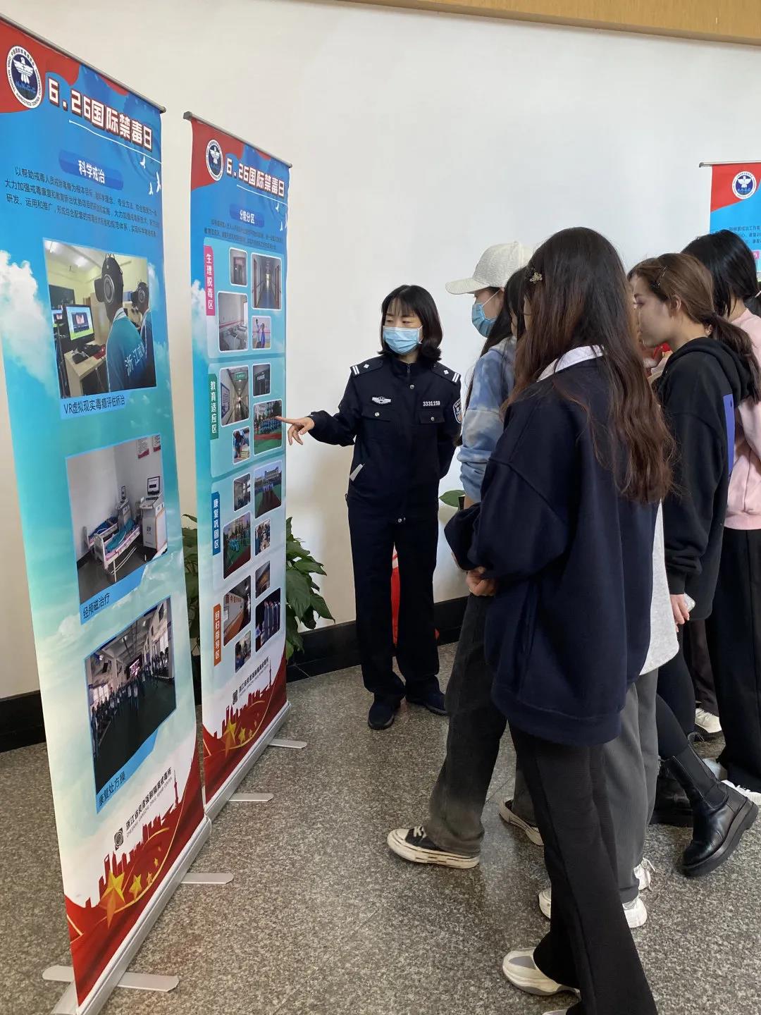 当天,良渚强制隔离戒毒所警官在现场设立了禁毒知识展板,摆放了仿真毒品,并向同学们分发宣传册。
