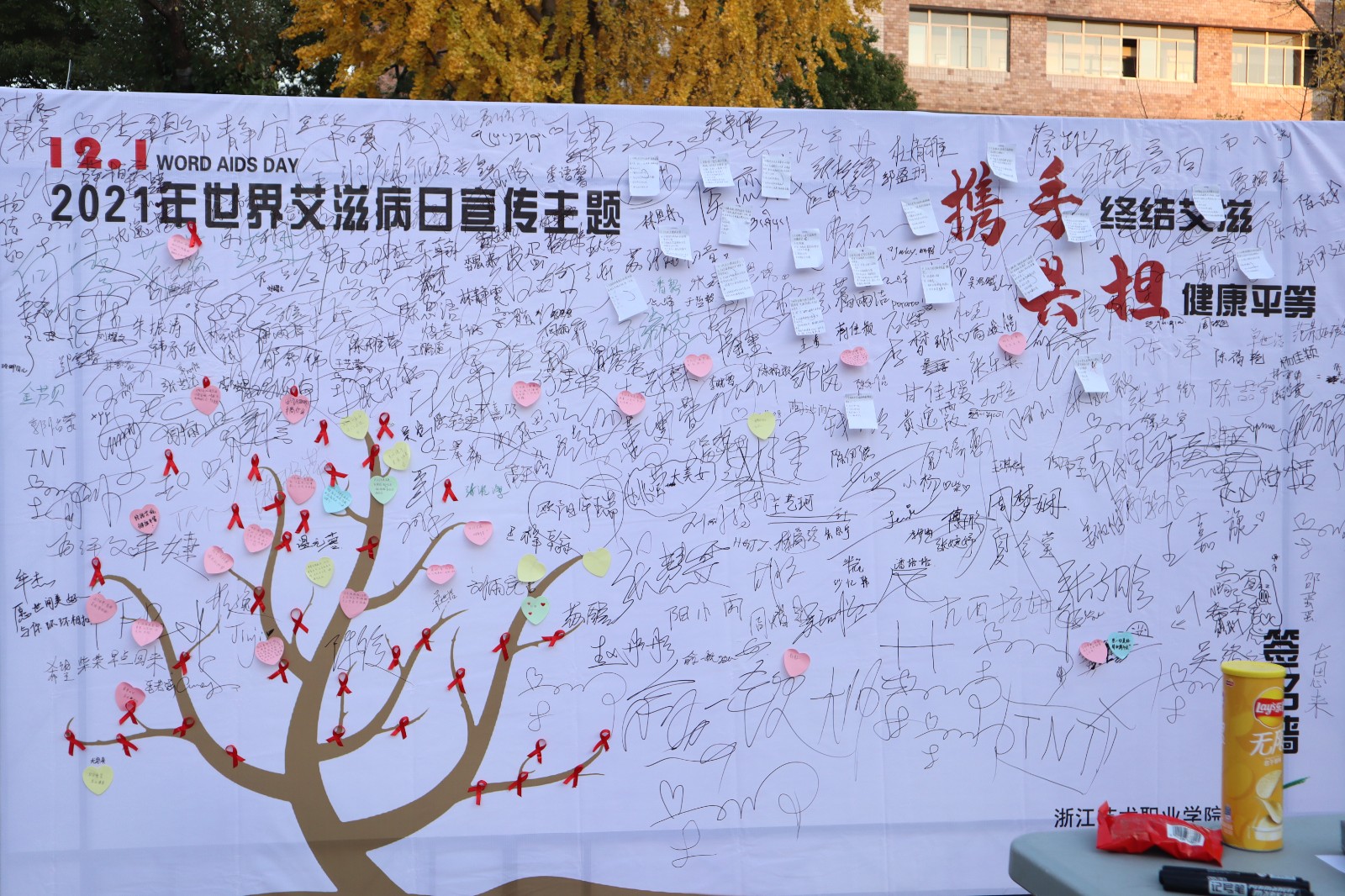 防艾知识宣传。12月1日起,校团委在学校中心广场设立防艾宣传点,向全校师生宣传防艾相关知识。身穿玩偶服的“艾滋病感染者”和大家互动拥抱,充分地让大家正视、尊重艾滋病感染者。往来的同学们更是在签名版上留下了自己对艾滋感染者的心语心愿。