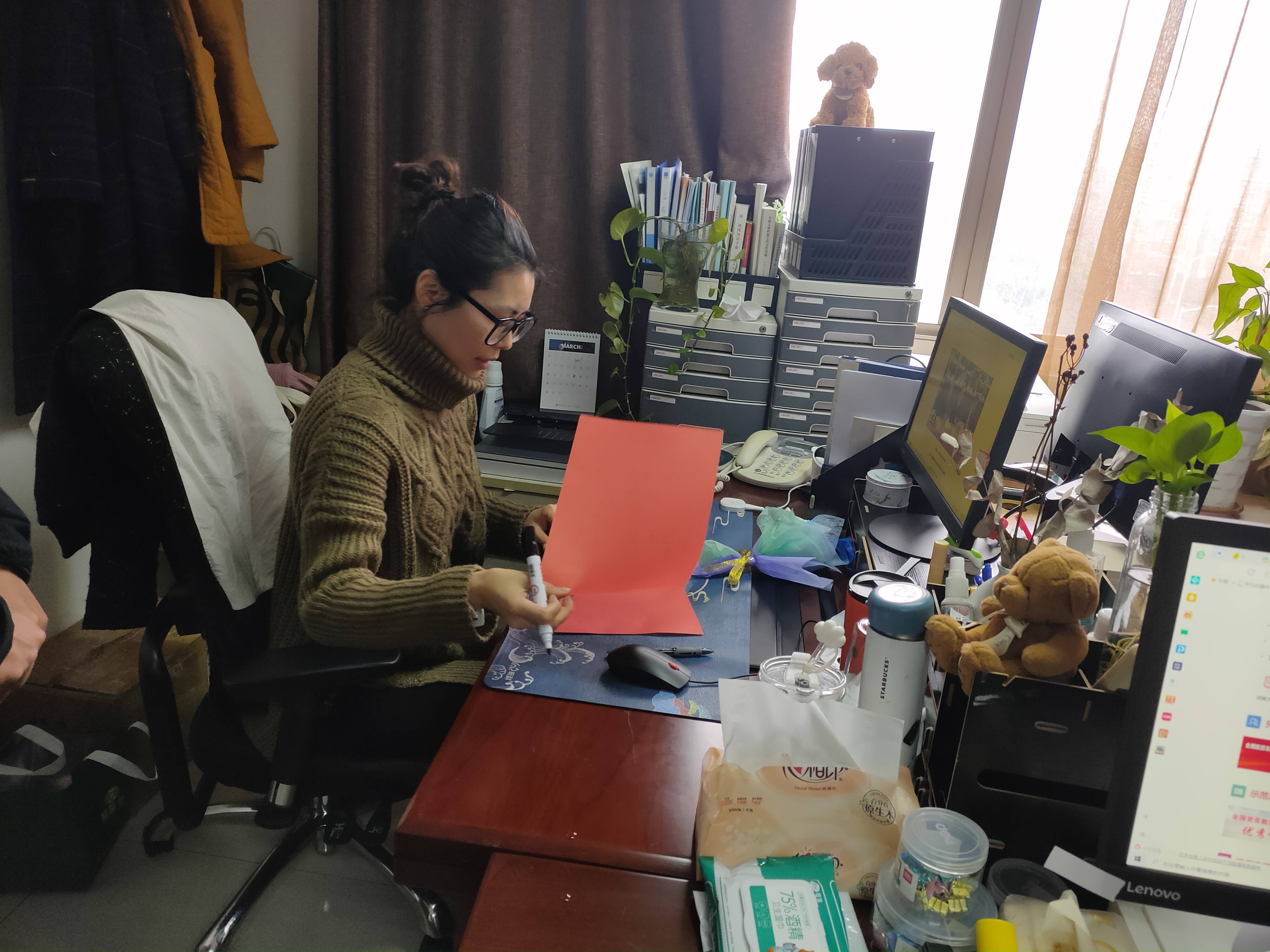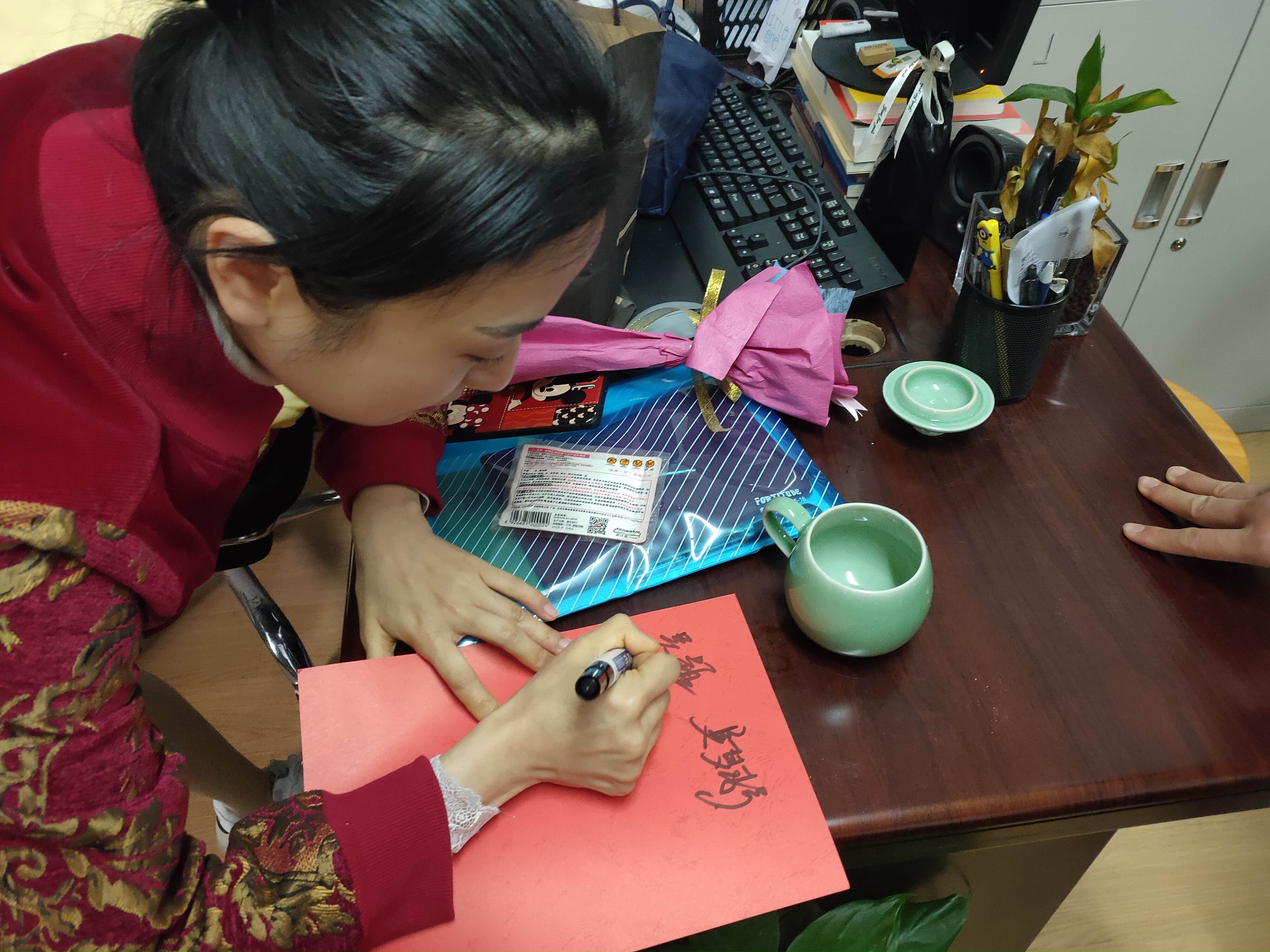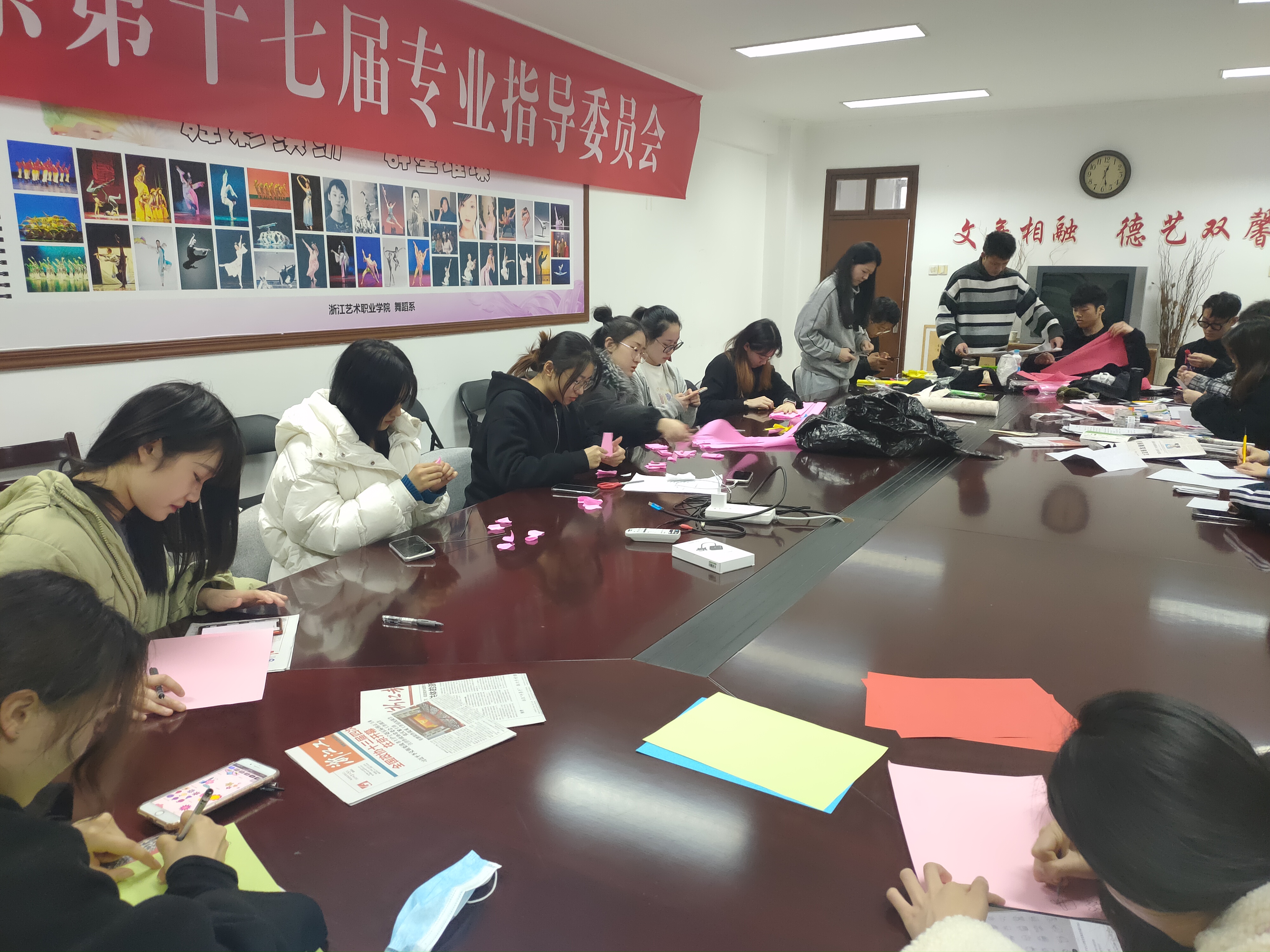 舞蹈系团委学生会的同学们别出心裁,利用周末时间亲手编织爱的花朵,在节日当天给老师们一个惊喜。同学们在前一天准备好了手工制作材料,分工明确,男生女生一起,有的剪“花枝”,有的剪“花瓣”,有的把“花瓣”们粘成“花朵”,有的把做好的“花”包装好。心灵手巧的他们从零学起,仅用一整天的时间就做出了300朵手工花。