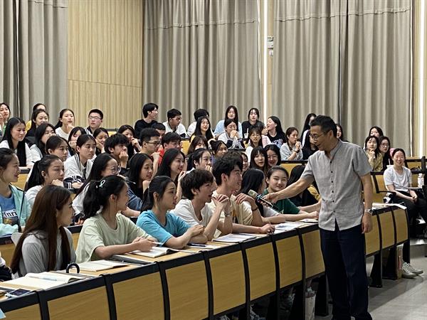 褚老师通过热身活动“你来评评分”,调动同学们的积极性。针对《爱人始于爱己,爱世发于爱人》和《兼爱人生》两篇论述文,同学们各抒己见,想法不一,整场讲座的“干货”由此开启。
