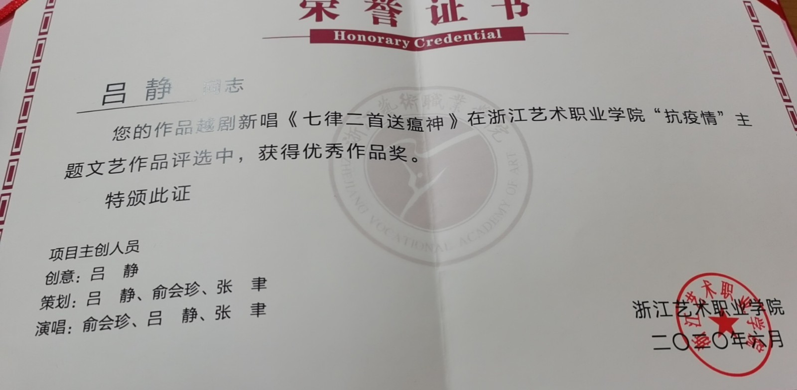 一直以来,戏曲学院将立德树人放在首位,将培养社会主义文艺事业建设者和接班人作为根本任务,戏曲学院的专业教师们努力将课程思政融入专业教学,取得了良好成效。吕静将课程思政深融于专业课堂教学,带领同学们创作了越剧套曲《悯农》、跟师生们一起创作了越音吟诵《有一种力量》等作品,主讲的越剧唱腔课程《我为长征歌》代表学校参加全国中高等艺术职业院校“课程思政”展示交流活动;主持的《育人与培艺双元合一——越剧唱腔教学改革与实践》入选浙江省高等教育“十三五”教学改革项目;主持的越剧唱腔课程成为学校首届“课程思政”示范品牌;创作的越剧新唱《为女民兵题照》获杭州市微视频优秀作品奖,越剧新唱《送瘟神》等作品获学校“抗疫情”主题文艺创作优秀作品。同时,身为滨江区政协委员的她,不仅积极参政议政,还以公益使者身份慰问环卫工人,监制创作抗疫微电影《倾城之爱》,以艺术的力量奉献和服务社会。