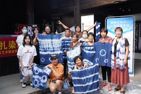 非遗研学开发师生团队对农民学员和研学游客进行了《编织》《套色剪纸》《扎染》和《水印木刻版画》四门课程培训,结合专业实践,丰富未来乡村研学内容。专业师生手把手认真教,培训学员耐心认真学。有扎染学员表示:很感谢浙艺给我们提供免费学习的机会,以前想学,没地方学,找不到人教。这次收获满满,也学会了基础的技法。有一些体验者是专门从外地过来报名的游客,对于此次余东之行还能来体验制作出自己的手工艺作品,感到是一次非常有意义的旅行,更是询问老师下一次来余东开展课程的活动时间,想再次来报名参与,觉得此次活动为余东村的文旅开发拓展了新的方向和发展空间。来乡村研学的学生说:“雕版印刷体验让我学到了课堂上学不到的知识,今天玩得很开心,收获很大。”当地农民的反馈都很热情,体验到有农民画元素的非遗手工艺技能,对于自己的作品也是满意又欣喜,期待将这些有农民画元素的手工作品,推向市场,拓展农民画艺术衍生品,找到致富新路径。许多农民学员将自己的作品通过微信、抖音等平台进行首秀展示。