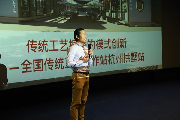 李罕梁作题为《传统工艺振兴的模式创新》的学术讲座。李罕梁首先引入传统工艺工作站杭州拱墅站(以下简称“拱墅站”)的运营模式案例,介绍了拱墅站的工作机制和工作任务。拱墅站立足于乡村传统工艺的城市端,以“政府部门主导、专业机构运营、社会联盟参与”模式,通过“城市公共文化空间”加展示、交流、公共教育、研究等常态化活动的形态,加强非遗生产性保护,提高传统工艺传承实践水平和发展水平,推动文创产品开发,全面实现振兴传统工艺的目的。同时围绕非遗IP研究、非遗研学教育、非遗创新转化等展开讲述。非遗IP研究,从传统工艺产品知识产权保护和动漫形象创新等方面,推动传统文化适应当下社会;非遗研学和教育,从研习课程开展和教育素材积累等方面,推动传统文化融入研培体系;非遗创新转化,从理念创新、功能创新、设计创新、材料创新等方面,推动传统工艺迭代更新;工作站联络交流中心,从研讨会、分享会等方面,推动各地传统工艺传承人之间的互动交流。拱墅站“产、学、研、创”各个环节,为校企合作、产学研创融合提供了更多思路。