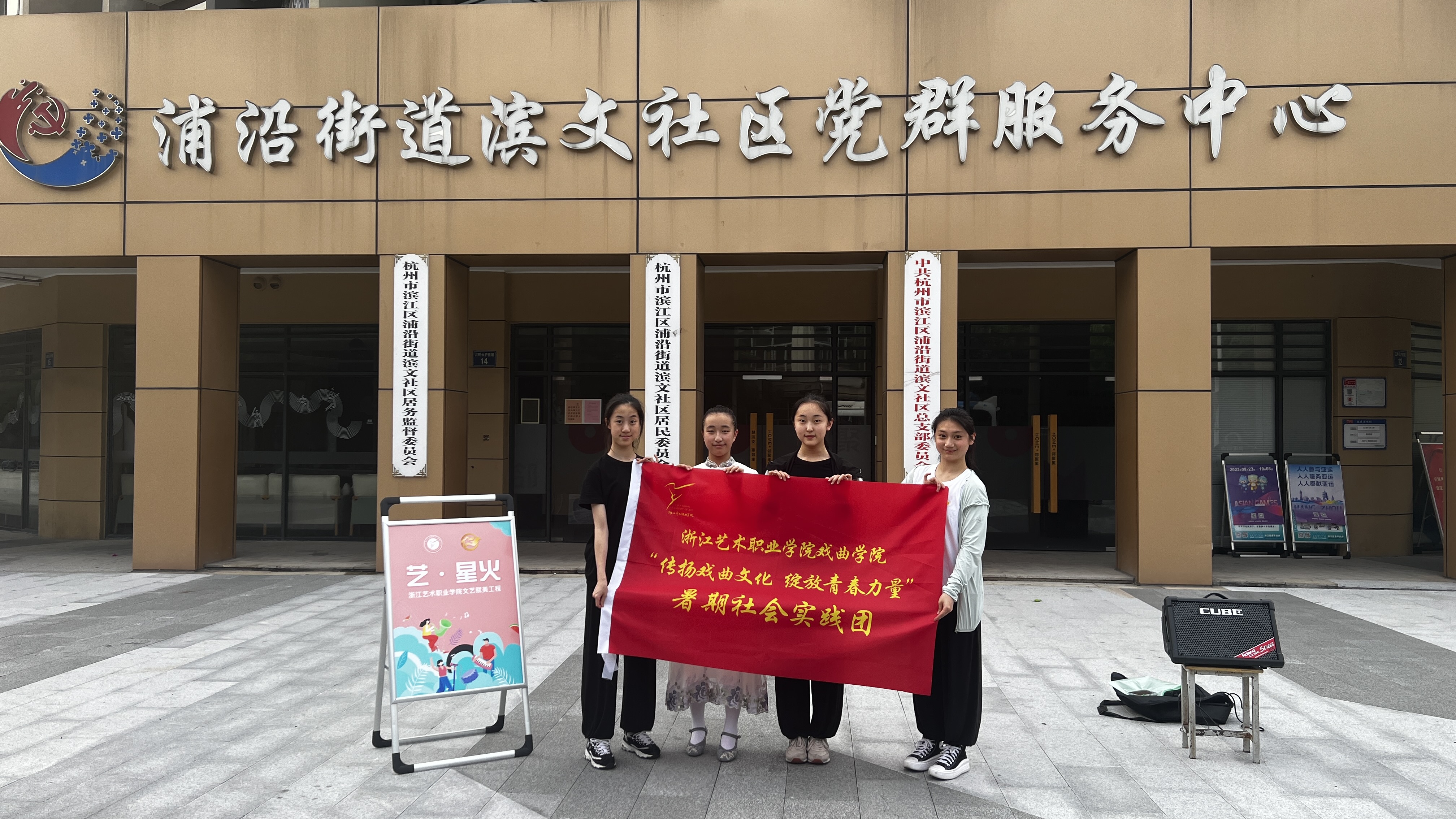 在缪海洁和耿绿洁两位老师的带领下,实践团成员与民营剧团学员组队,来到滨江艺术空间、宝龙城、滨文社区等地开展“文艺赋美”演出活动,丰富了民营剧团学员的培训内容,激发了民营剧团演员的学习热情,坚定了传播越剧艺术的文化自信。